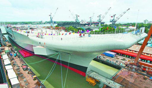 印度第一艘国产航母“维克兰特”号12日在南部港口科钦下水。“维克兰特”号排水量为3.7万吨,舰身长260米,宽60米,最高航速28节,可持续航行8000海里。该航母有一个相当于两个足球场大的甲板,可搭载36架军用飞机。
