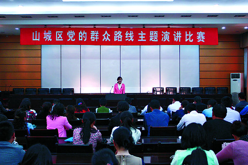 为教育引导广大党员干部强化全心全意为人民服务的宗旨意识,树立群众观点,提高服务群众的水平,5月8日,山城区举办了党的群众路线主题演讲比赛。王欢 摄