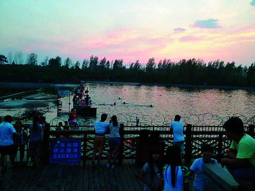 为避免发生溺水事故,有关部门在淇河禁游区设立警示标语,但仍有人忽视安全隐患,在禁游区内游泳。图为7月13日傍晚,不少人在淇水诗苑旁一处禁游区游泳。本报记者 陈海寅 摄