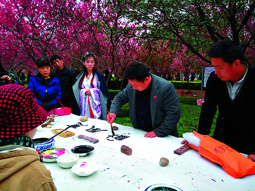 一边是草长莺飞、樱花盛放,一边是书画家泼墨作画、挥毫题字,这为第二届中国鹤壁樱花文化节增添了不少雅趣。