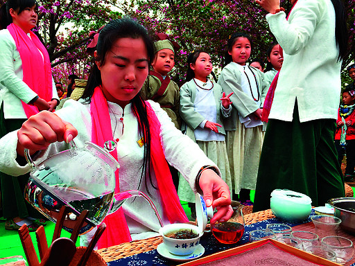 4月2日,一名身着古装的茶艺表演者,在最美樱花大道上,优雅地展示着冲茶、泡茶、品茶的各个程序,给人以美的享受。