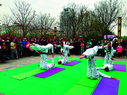 4月3日、4日,樱花树旁,30名身穿白衣的瑜伽表演者,成为一道别样风景。