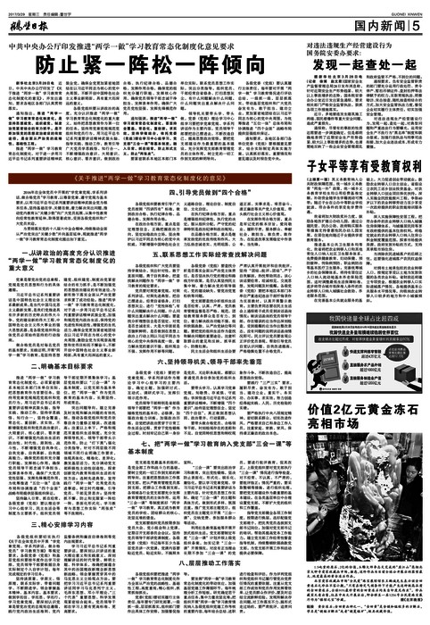 中共中央办公厅印发推进“两学一做”学习教育常态化制度化意见要求防止紧一阵松一阵倾向