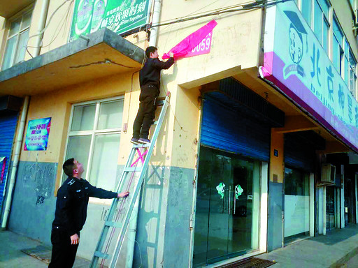 4月12日下午,淇滨区黎阳路办事处城管中队在梅花巷例行巡查时,看到有广告违规张贴、占道经营、店外经营等现象,城管队员立即对这些问题进行了规范治理。图为城管队员在清理违规张贴的广告。