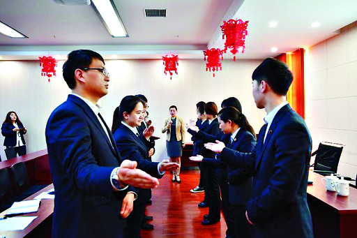 洛阳银行鹤壁分行员工正在接受礼仪指导。 张钢锁 摄
