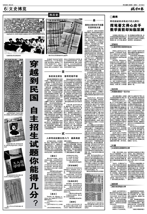 1917年夏,罗家伦21岁,恰逢北京大学在上海招生,身为《复旦杂志》编辑的他前往应试。当时,胡适刚从美国回来,也参加了北大上海招生考试的阅卷工作。在招生会议上,当时还只是一个普通教授的胡适激动地说:“我看了一篇作文,给了满分,希望学校能录取这位有才华的考生。”当委员们翻阅这名考生的成绩单时,却发现他的数学考了零分,其他各科成绩也并不出众。当时,主持招生会议的校长蔡元培明确表态,支持胡适的意见。在蔡、胡二人的执意要求下,这位除了会写作文其他科目偏差的考生最终被北大外国文学专业录取了。