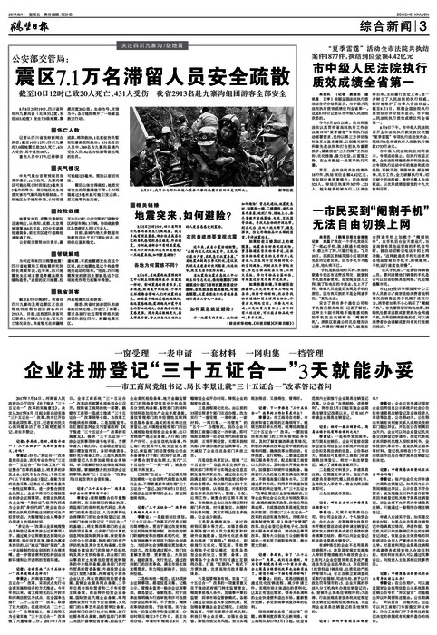 公安部交管局: 震区7.1万名滞留人员安全疏散 截至10日12时已致20人死亡、431人受伤 我省2913名赴九寨沟组团游客全部安全