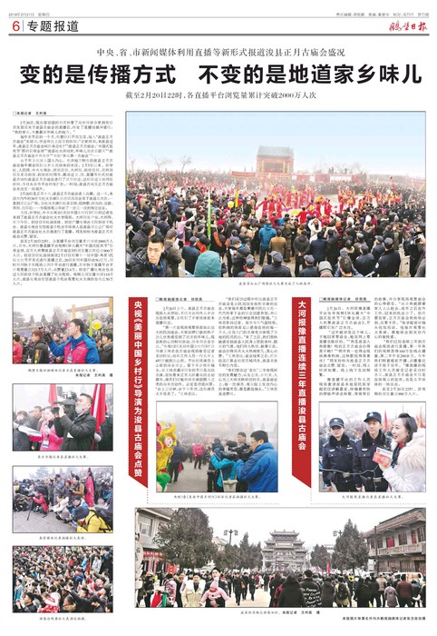 中央、省、市新闻媒体利用直播等新形式报道浚县正月古庙会盛况 变的是传播方式 不变的是地道家乡味儿 截至2月20日22时,各直播平台浏览量累计突破2000万人次
