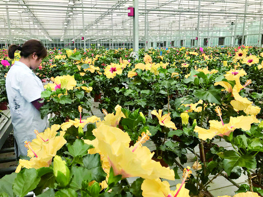 左图:鹤壁建业绿色基地的丹麦木槿jǐn)温室里,一朵朵木槿花铆足了劲儿开放,色泽艳丽。