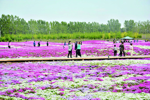 上图:游客漫步鹤壁建业绿色基地东部花海景观区。