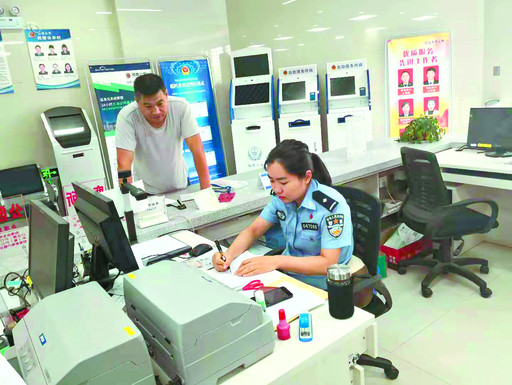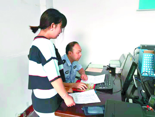 在山城区行政服务中心,民警为居民办理户籍业务。