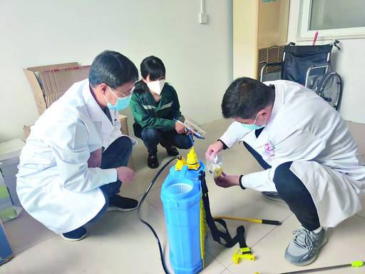 王建光(右一)在淇县高村镇中心卫生院做环境卫生消杀准备工作。