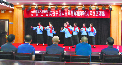 7月28日下午,市退役军人事务局联合市总工会组织文化志愿服务队,走进市军休中心开展庆祝中国人民解放军建军95周年文艺演出,慰问我市军休干部,为他们送上节日的祝福。演出在舞蹈《好日子》中拉开帷幕,诗朗诵、戏曲、合唱、笛子独奏等16个精彩文艺节目,共同谱写了军政军民团结、双拥共建的动人乐章。本报记者 董丹 摄