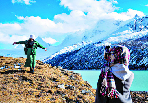 游客在萨普雪山脚下拍照留念(10月28日摄)。